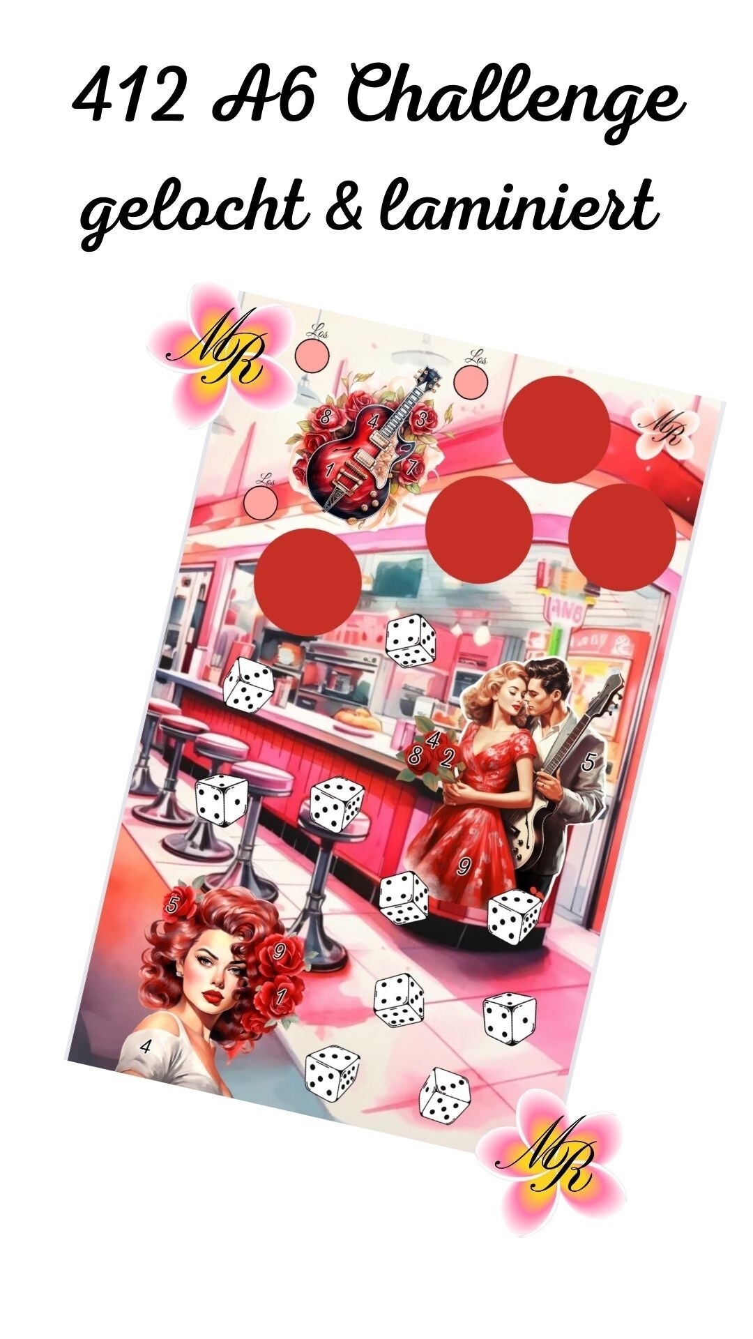 Eine laminierte und gelochte A6 Challenge zum abstreichen, rubbeln, losen und würfeln
