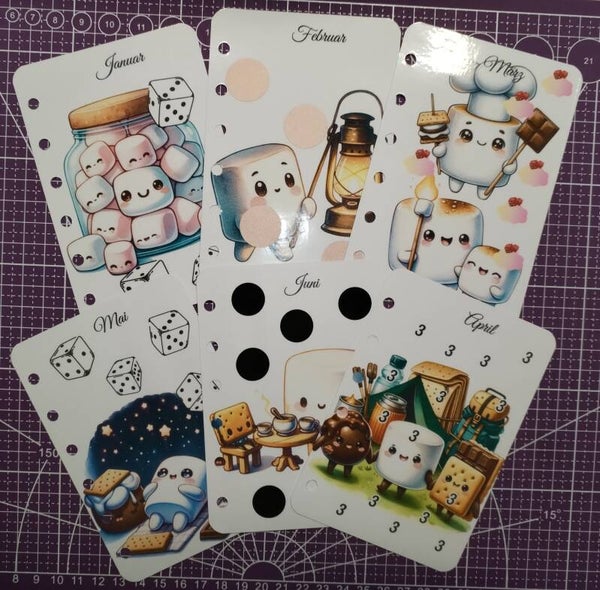 Zwölf laminierte und gelochte A7 Challenge zum abstreichen, rubbeln, losen und würfeln