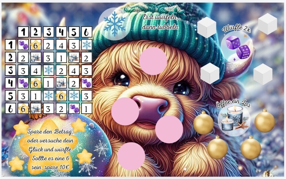 Eine 3er Klappkarte zum abstreichen, rubbeln, losen und würfeln