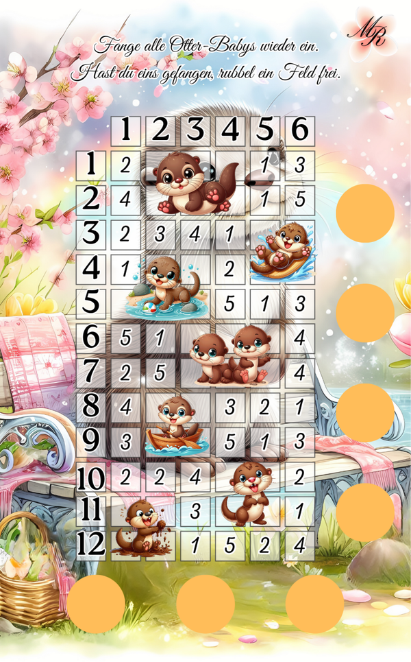 Ein Deckblatt mit vier laminierten und gelochten A6 Challenges zum abstreichen, rubbeln und würfeln.