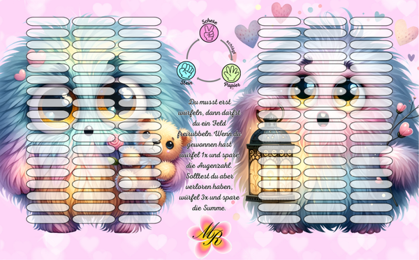 Eine laminierte und gelochte A6 Challenge zum rubbeln und würfeln.