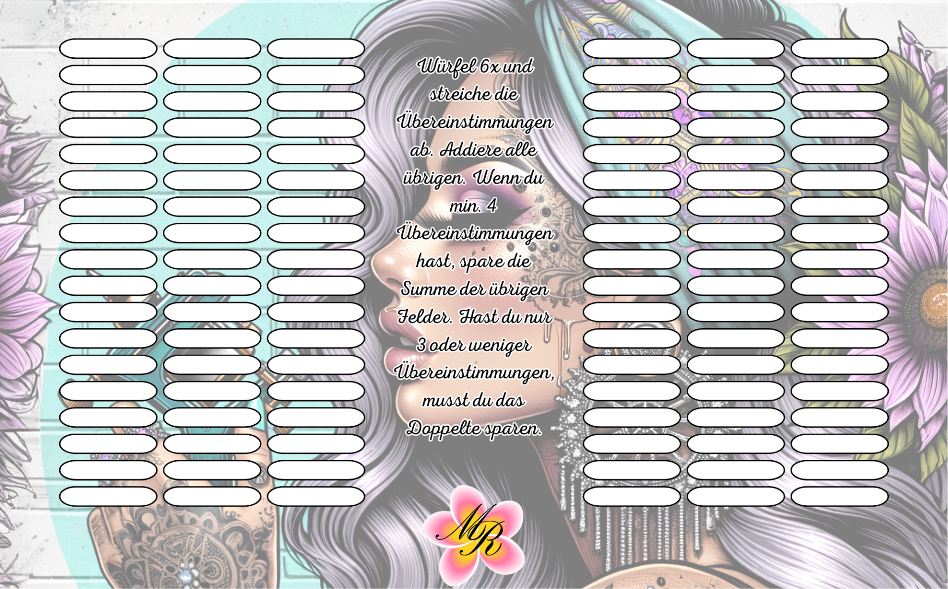 Eine laminierte und gelochte A6 Challenge zum abstreichen und würfeln.
